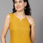 Mustard Self Embroidered Sleeveless Short Kurti