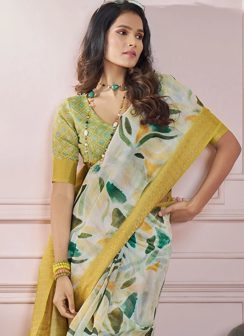 - he Mustard Soft Silk Printed Zari Woven Saree is a perfect amalgamation of elegance and modern craftsmanship. The saree is crafted from premiumquality soft silk ensuring a luxurious feel and a graceful drape. Its soothing Mustard shade is accentuated with intricate zari weaving adding a touch of opulence to its understated charm. The printed motifs on the saree bring a contemporary flair blending tradition with modern aesthetics.
